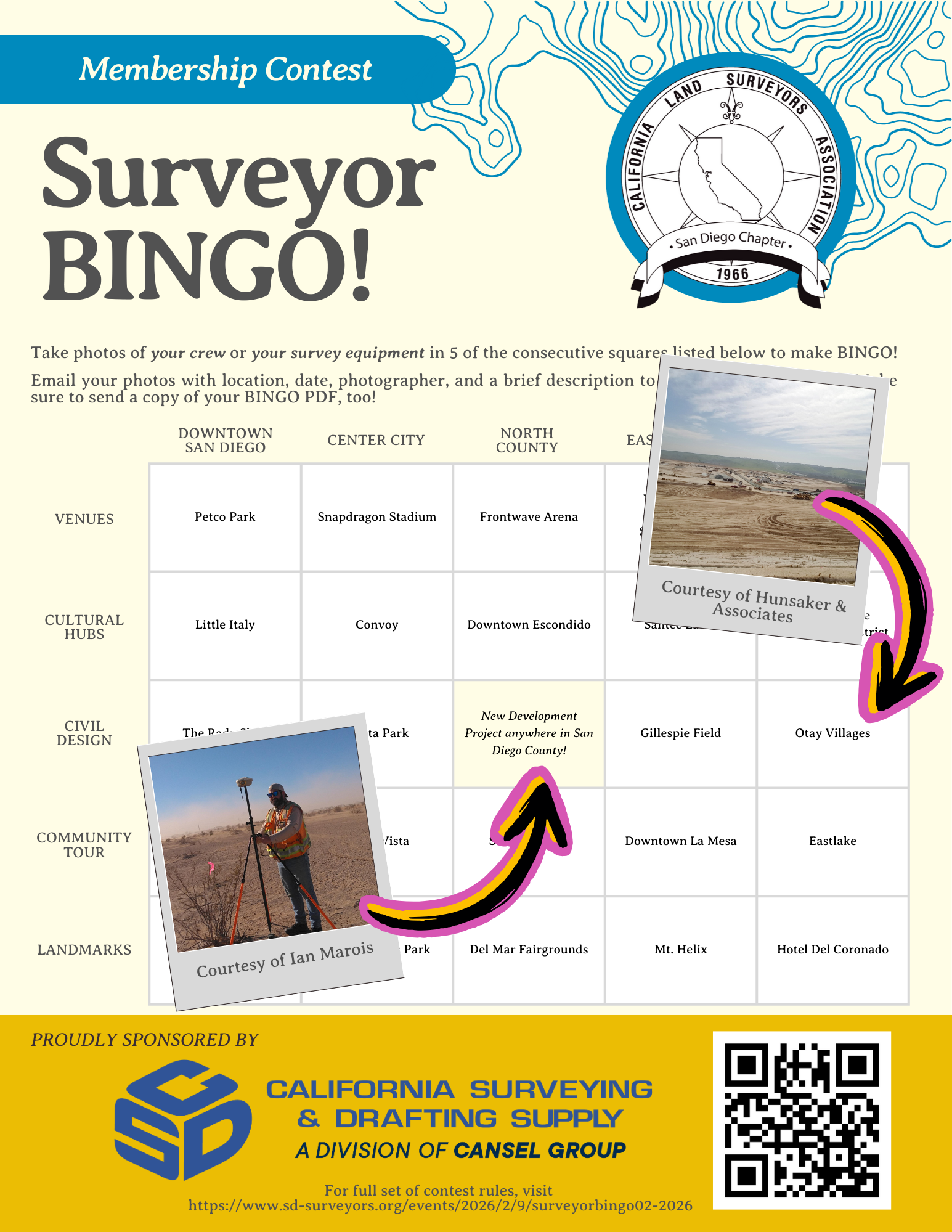 San Diego, share your photos of what surveying looks like to you. Take five photos in a row on your BINGO card and send them to us for your chance to win two (2) golf tickets to the Marv Sylakowski Memorial Scholarship Golf Tournament sponsored by California Surveying & Drafting Supply. Entry ends February 28, 2026.
