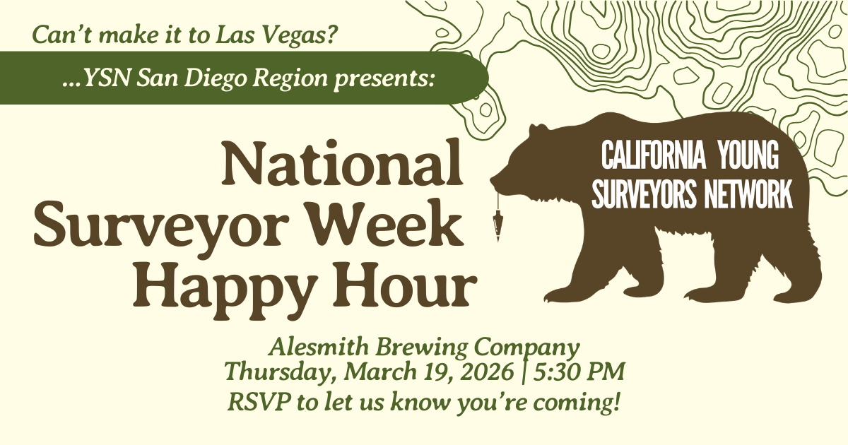 Join Parker Phillips, Regional Director of the CA YSN San Diego Region - and the rest of San Diego - for a FREE networking event! Share a drink (or awesome food truck dinner) & swap stories with the San Diego surveying community. Think of this as a fun, relaxed social celebrating all that we do!