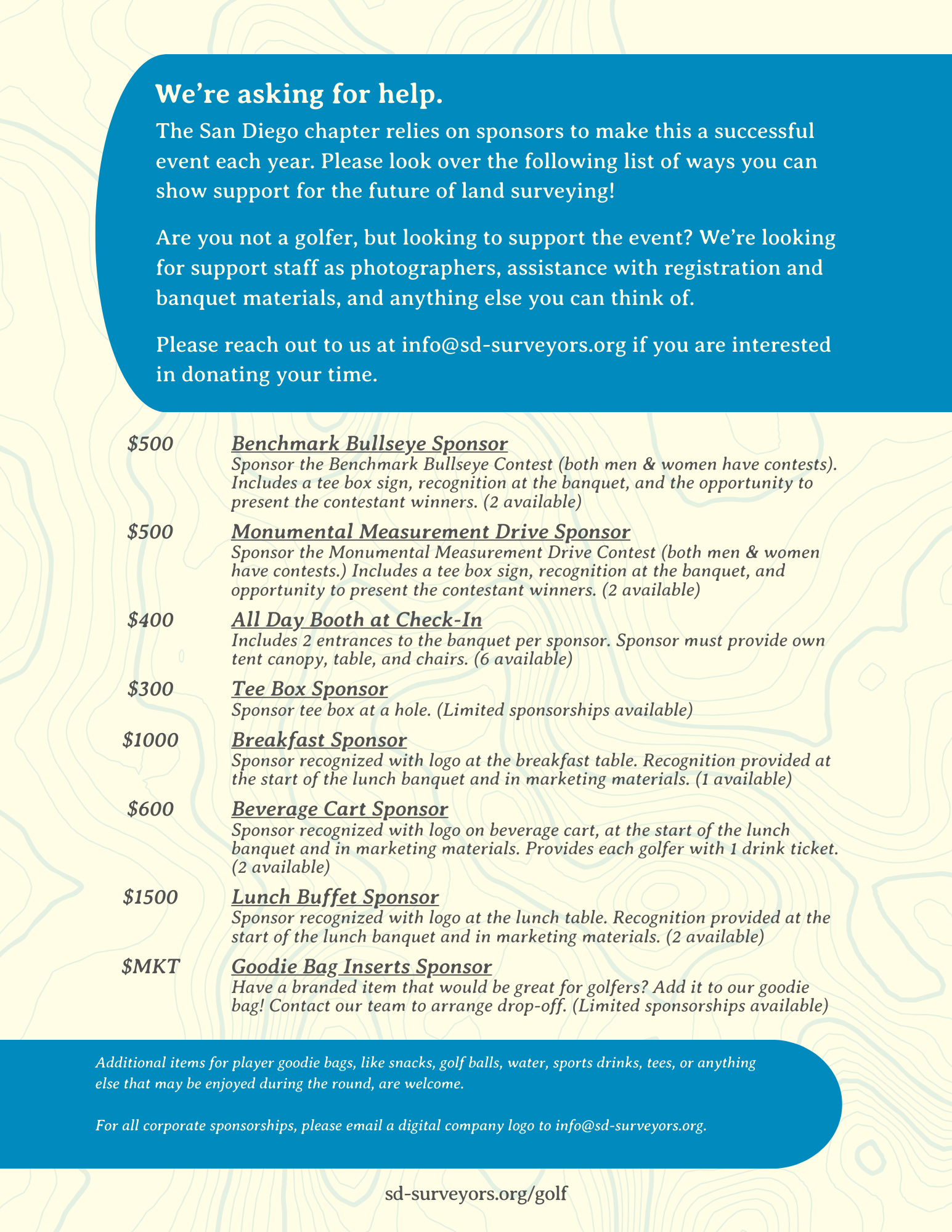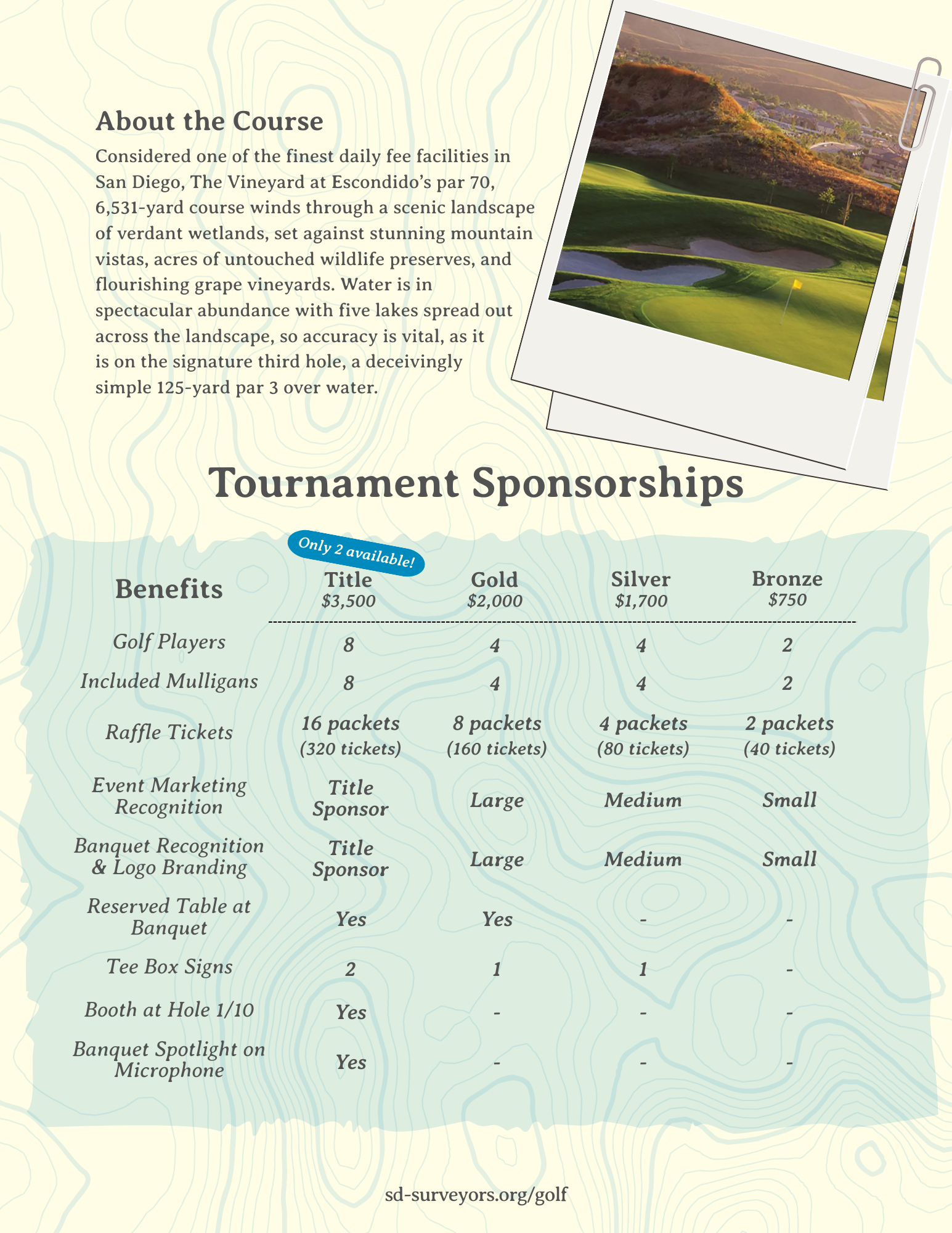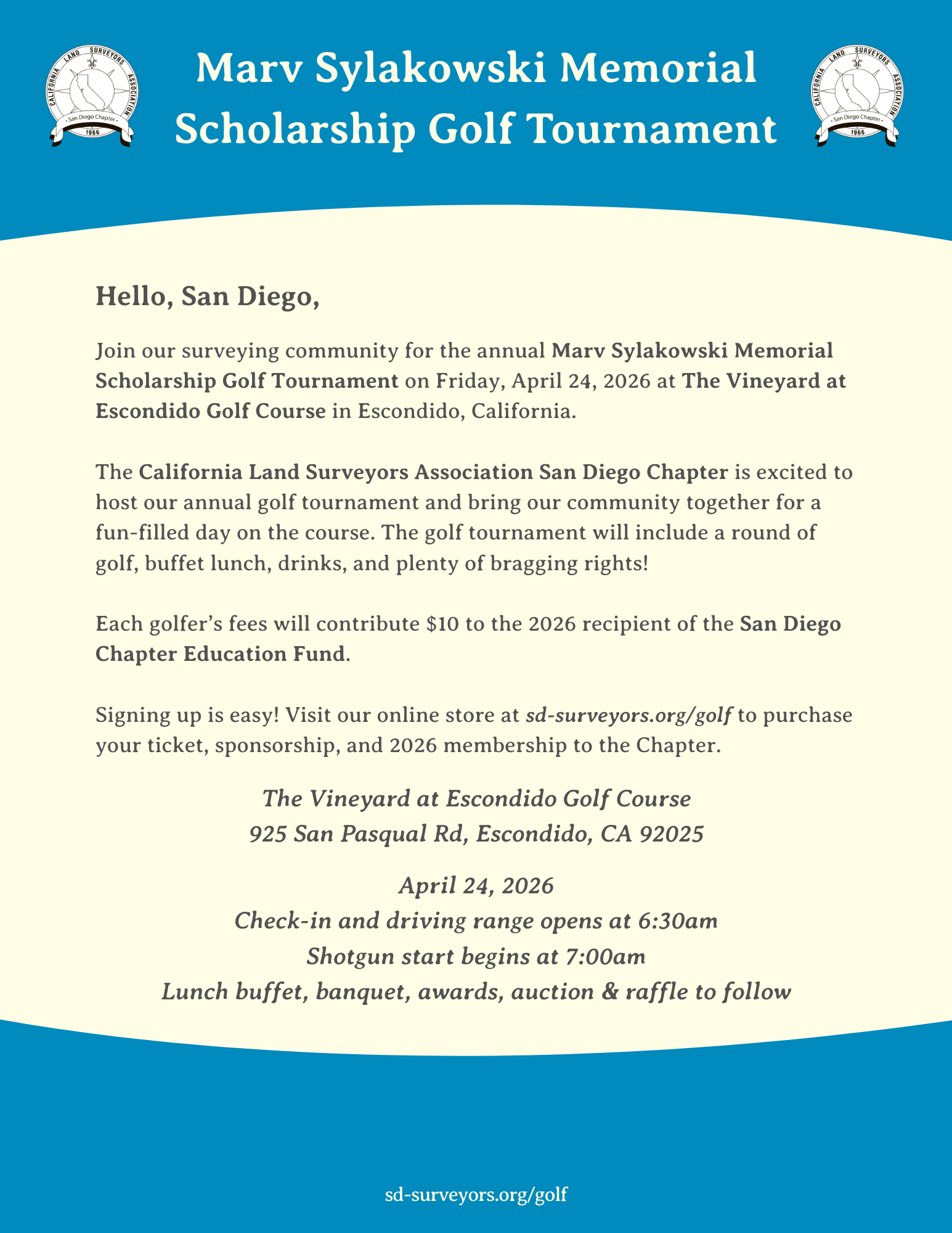 Welcome to the store for the 2026 Marv Sylakowski Memorial Scholarship Golf Tournament. Each purchase directly benefits the San Diego Chapter Education Fund. Awards for the San Diego Chapter Education Scholarships are planned for the summer of 2026. Select your title sponsorship, golf ticket, or individual sponsorship here!