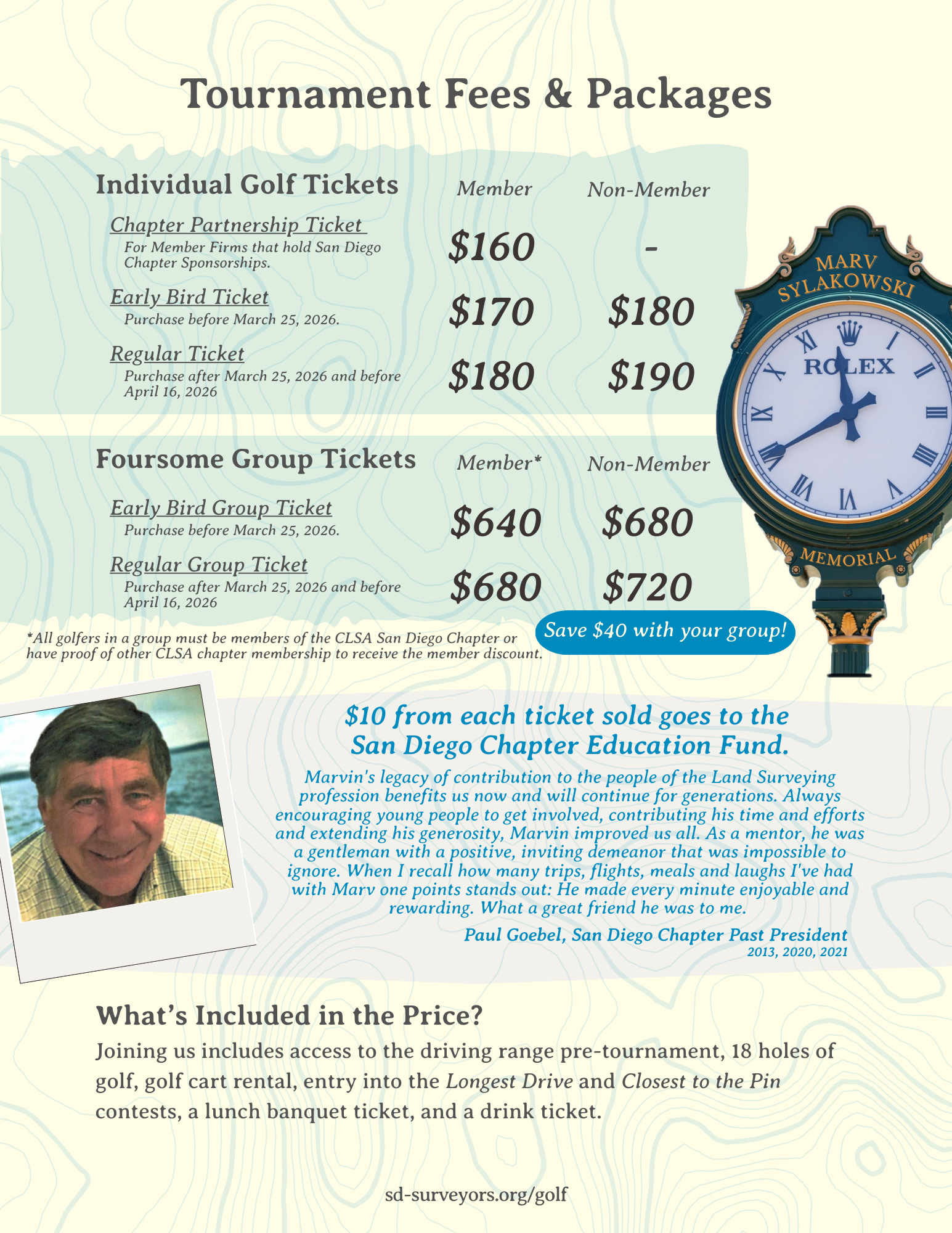 Member pricing applies only to San Diego Chapter 2026 Members and other CLSA Regional Chapter members (e.g., Riverside-San Bernardino, Orange County, Desert). All golfers in a group must be members to receive membership pricing. Proof of other chapter membership required for discount. The Early Bird Discount promotional period ends on March 25, 2025.